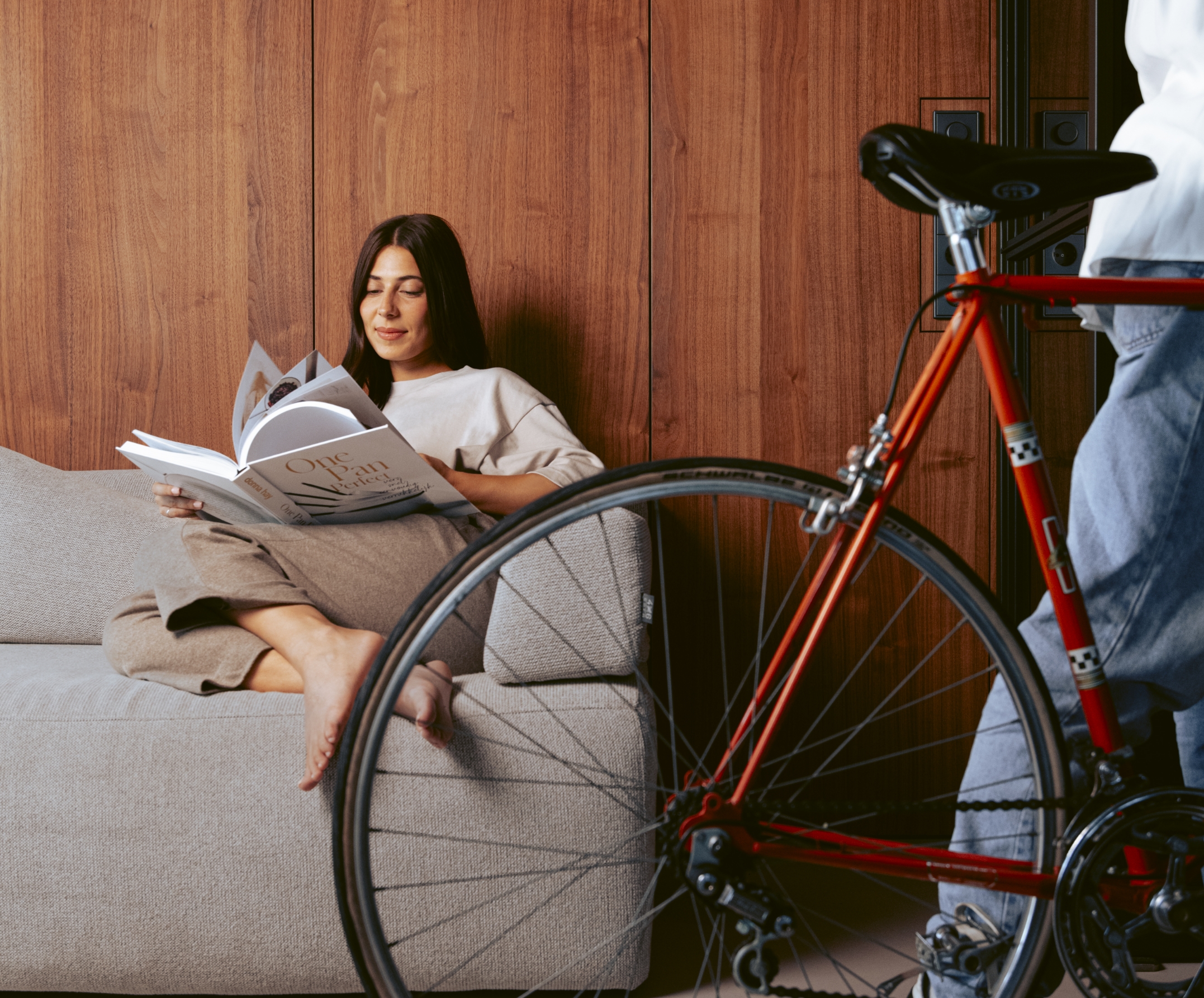 Omdat je zuinig bent op je (elektrische) fiets of bakfiets, bewaart Patchwork ‘m goed: in de beveiligde stalling verbonden door de rode loper met liften.
